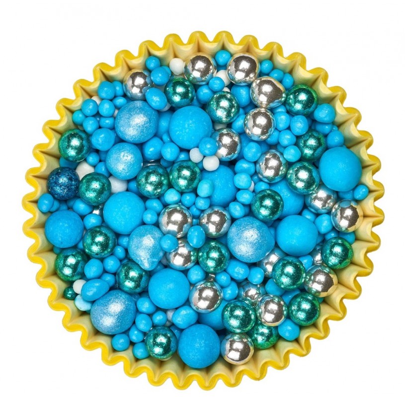 Hope è un mix luminoso di sfere di zucchero nelle tonalità dell’azzurro, del verde acqua e dell’argento, in diverse dimensioni. Le finiture perlate e metallizzate donano un effetto elegante e moderno, ideale per torte, cupcake e dessert decorati con stile.