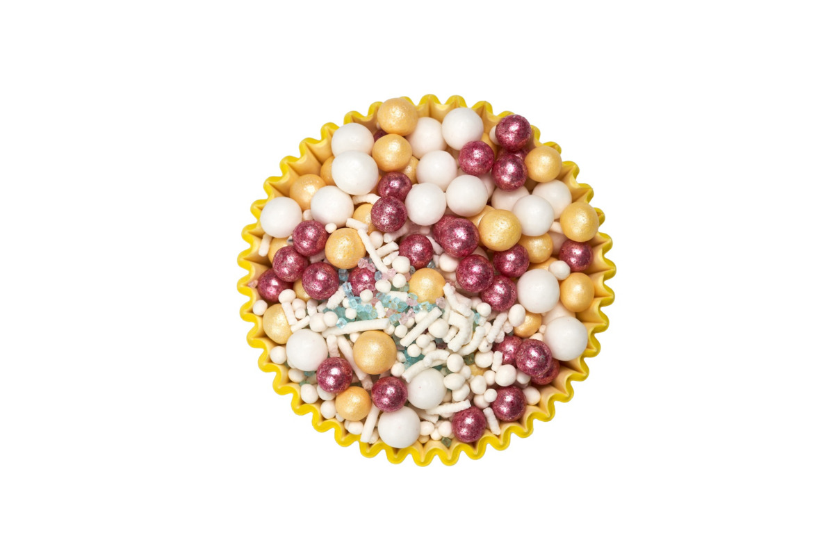 Granella di zucchero e sfere colorate di diverse dimensioni, dalle finiture perlate e metallizzate.