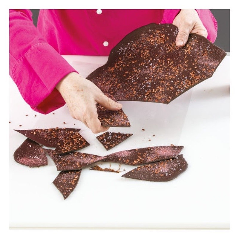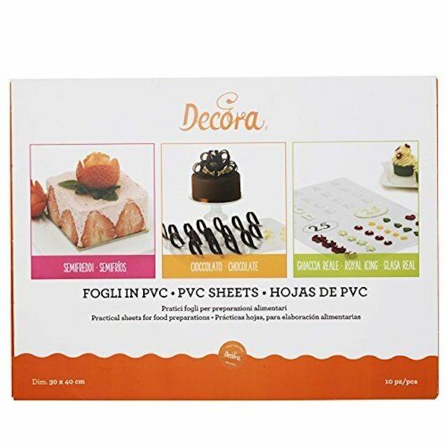 Confezione da 10 Fogli in PVC ad atto contatto per alimenti Dimensioni: 30x40cm; Spessore: 150 mycron I fogli in pvc per alimenti sono perfetti: come barriera antiaderente, per realizzare e sformare semifreddi, torte gelato e mousse utilizzando gli stampi e le sagome in acciaio; per la lavorazione del cioccolato; per realizzare originali decori.
