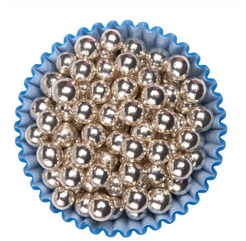 Sfere di zucchero argentate, eleganti e brillanti, ideali per decorare torte, cupcake e dolci raffinati. Prodotto artigianale Made in Italy.